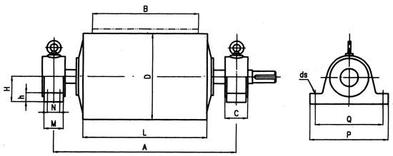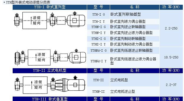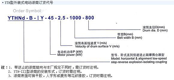 YTH型外装式电动滚筒由滚筒体、驱动器及电机支架三部分(Ⅱ型无电机支架)。滚筒体主要包括滚筒壳体、支座及装在滚筒内的减速器组成。驱动器主要包括电动机,连轴器、液力偶合器、逆止器、制动器等不见。电机支架是用型钢焊接而成,用于安装电动机和护罩,用户也可按需要自行设计制造.
