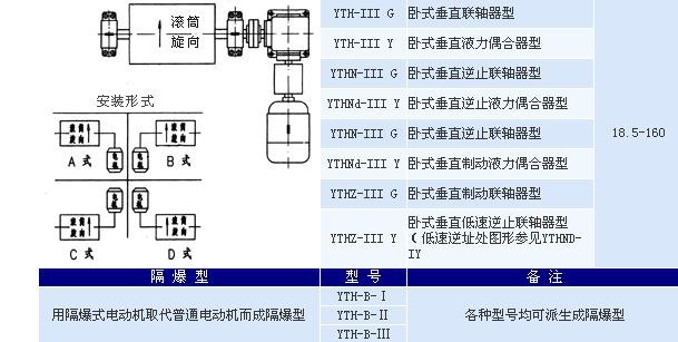 可配置液力偶合器、逆止器、制动器,也可配隔爆电机,适用作各种恶劣环境下及有隔爆要求的大中型带式输送机的驱动的装置。