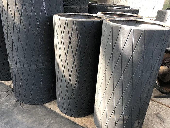 滚筒包胶是皮带输送运输系统中重要部件和组成部分,包胶后的滚筒能有效改善输送系统的运行状况,保护金属滚筒不被磨损,菱形花纹或人字形花纹,陶瓷胶板的包胶表面,能增大橡胶板表面摩擦力,能有效的防止滚筒与皮带之间的滑动摩擦,减少皮带打滑,减少滚筒表面的物料粘结,从而减小皮带的跑偏和磨损,提高运行效率,使滚筒与皮带同步运转,从而保证皮带高效的、大运量的运转。广泛用于:电厂、煤矿、水泥厂、钢铁、冶金、煤炭、化肥、粮库、港口等行业。